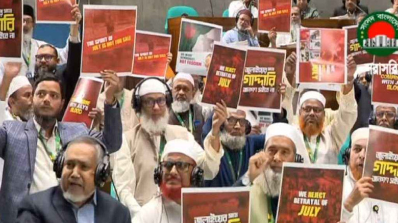 পরে বিরোধীদল জামায়াতে ইসলামী ও এনসিপিসহ ১১ দলীয় ঐক্য থেকে নির্বাচিত সংসদ সদস্যরা অধিবেশন কক্ষ থেকে ওয়াকআউট করেন।